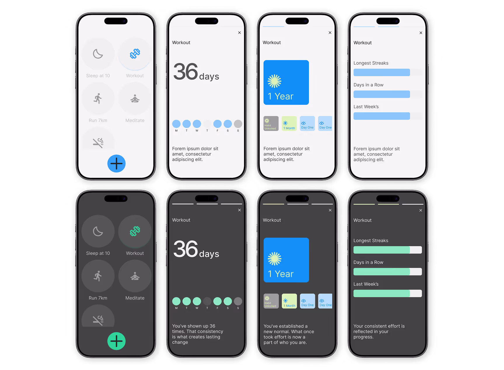 Building this system with custom components, auto-layouts, and variables taught me the true value of scalability. By setting up strict spacing rules, typography scales, and a color system using variables, I realized how much faster and more consistent the iteration process becomes. Designing complex, multi-variant components, like the interactive Habit Rings and the adaptive story-stats, demonstrated how maintaining a single source of truth prevents inconsistencies across an entire app.