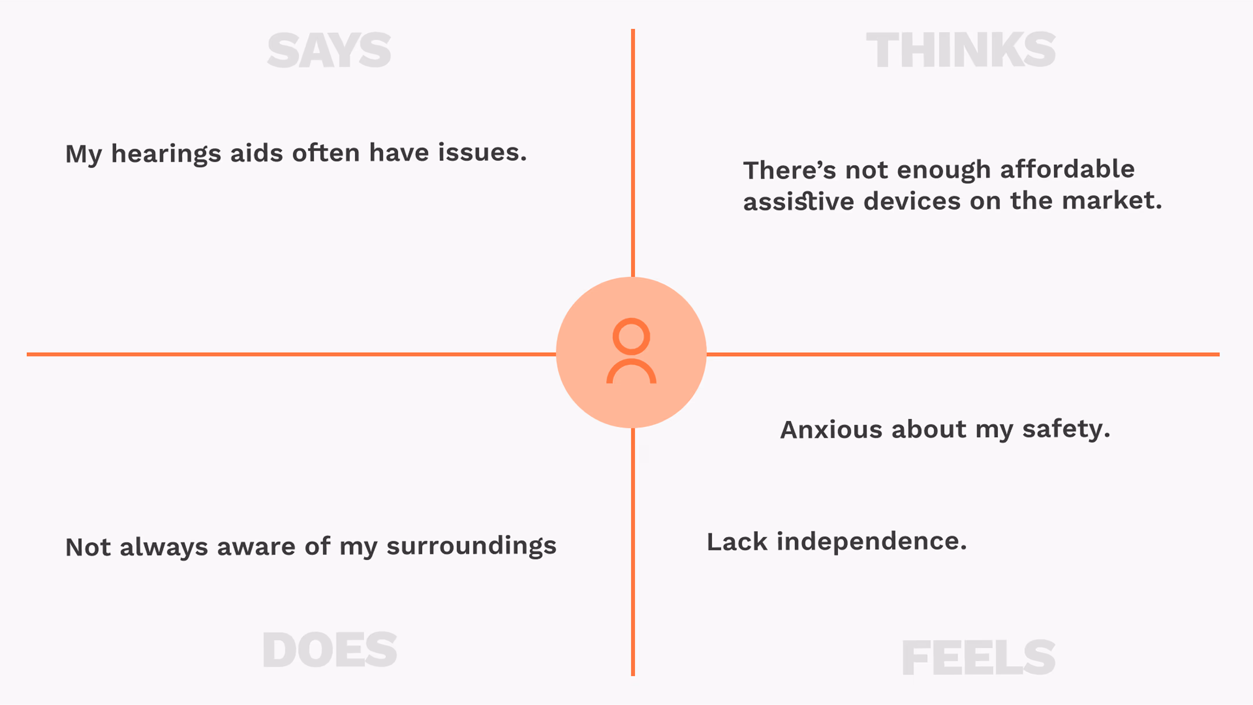 To bridge the immediate gap, I developed an empathy map based on secondary research and observation to guide our initial UX assumptions, mapping out user anxieties regarding safety and the desire for independence without reliance on a smartphone.