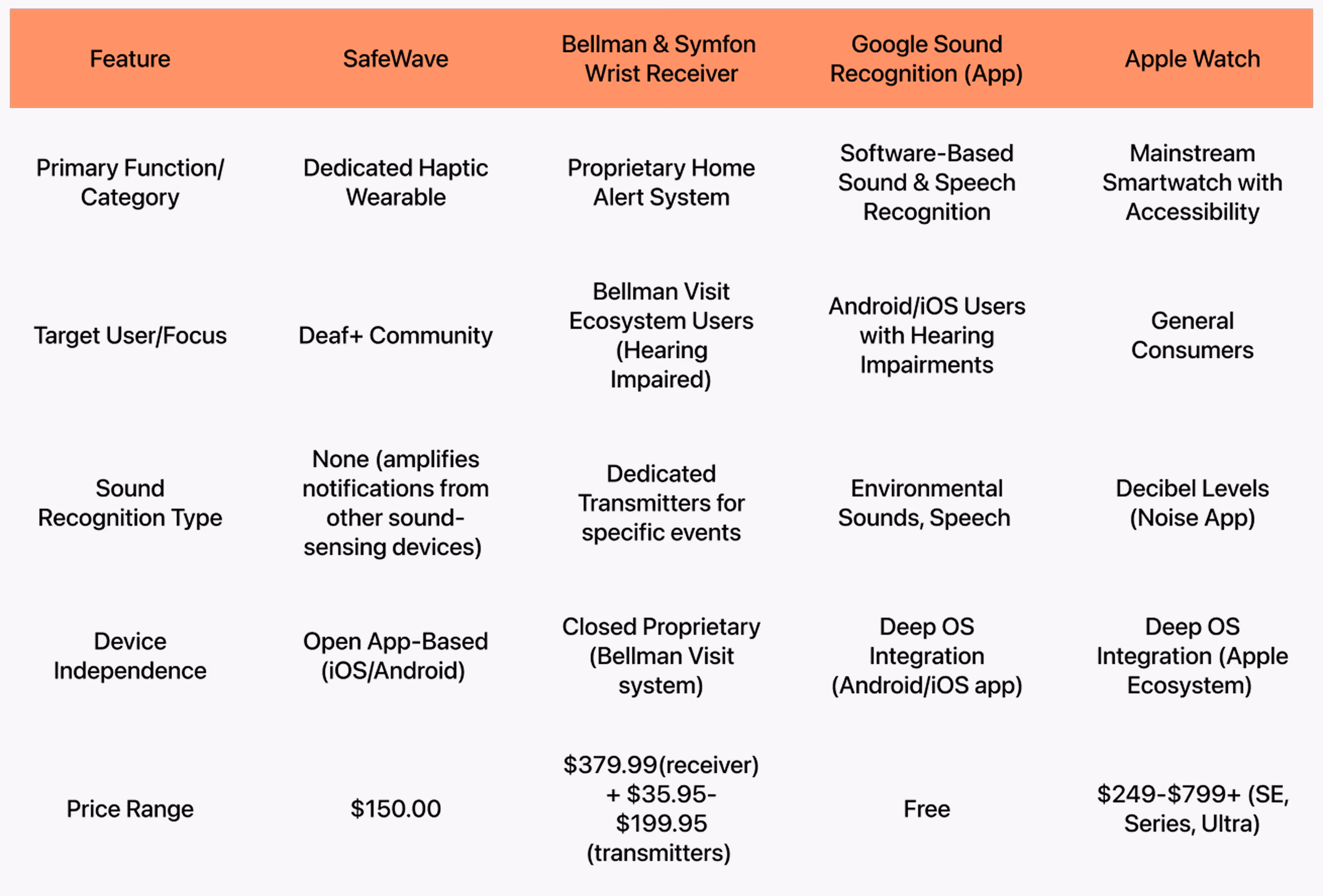 To understand the current landscape of assistive technologies and identify actionable opportunities, I conducted a rigorous audit of both direct and indirect competitors. I analyzed four primary solutions: SafeWave, the Bellman & Symfon Wrist Receiver, Google Sound Recognition, and the Apple Watch.
